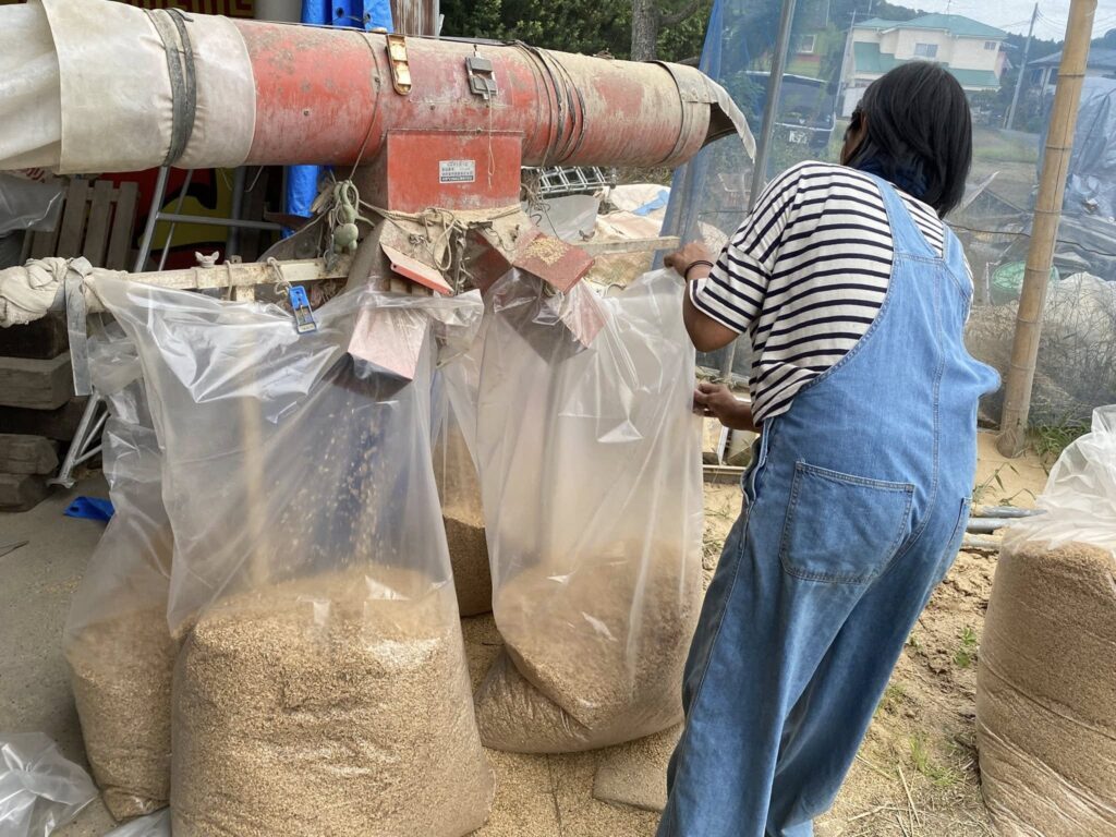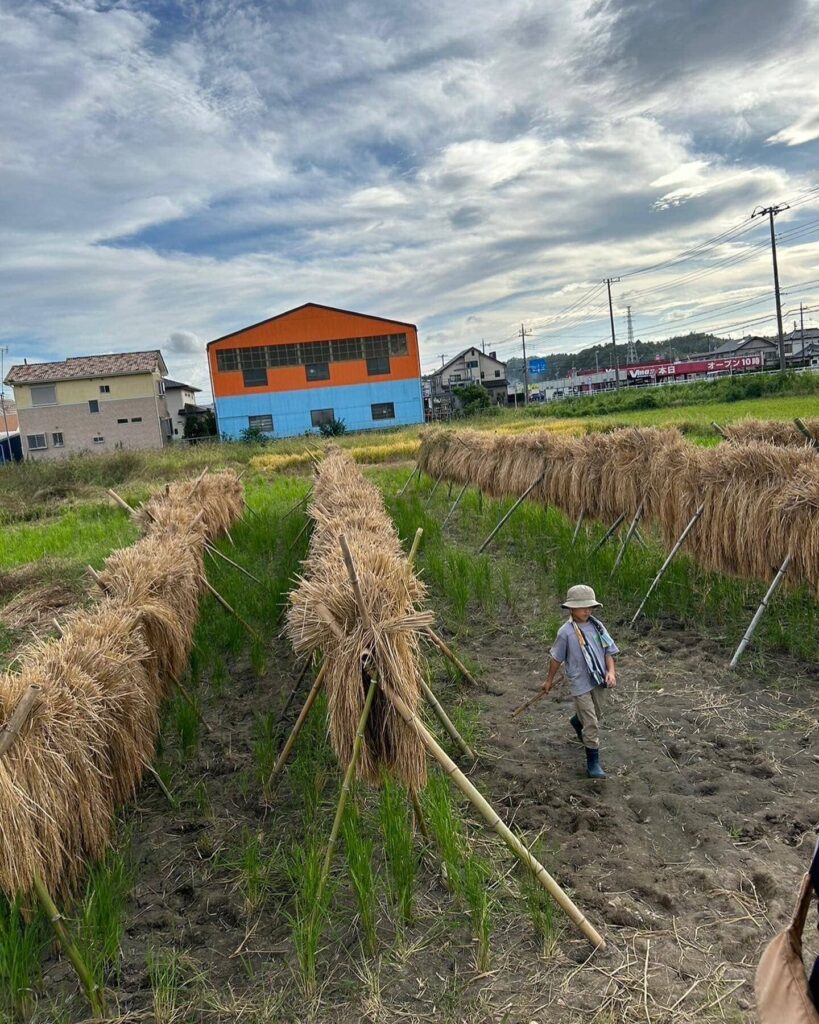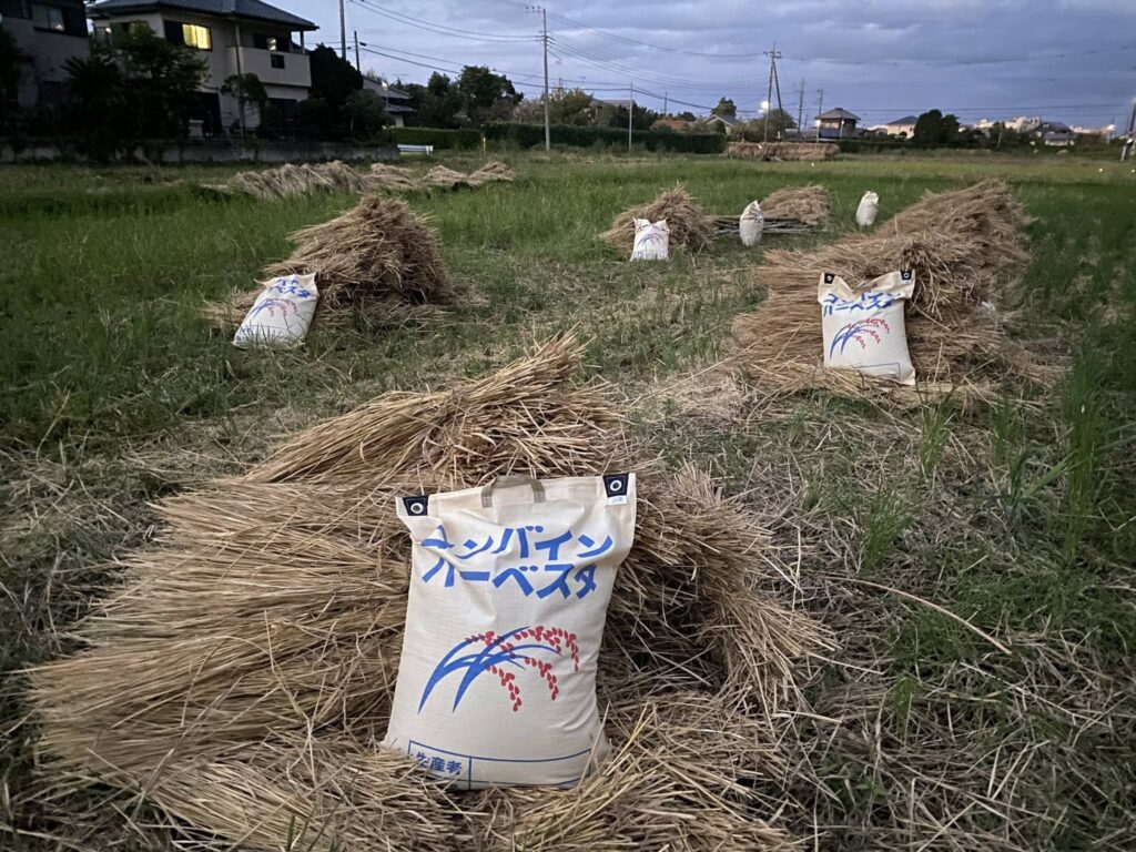 稲刈り後は竹でオダ掛け天日干し、ハーベスターで脱穀、近所の農家さんに籾摺りをお願いします。